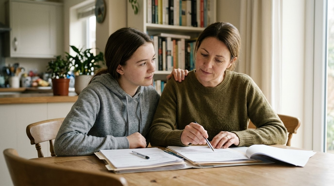 Alt text: Parent reviewing paperwork with teenage child at kitchen table, representing estate planning and trust decisions for minors.